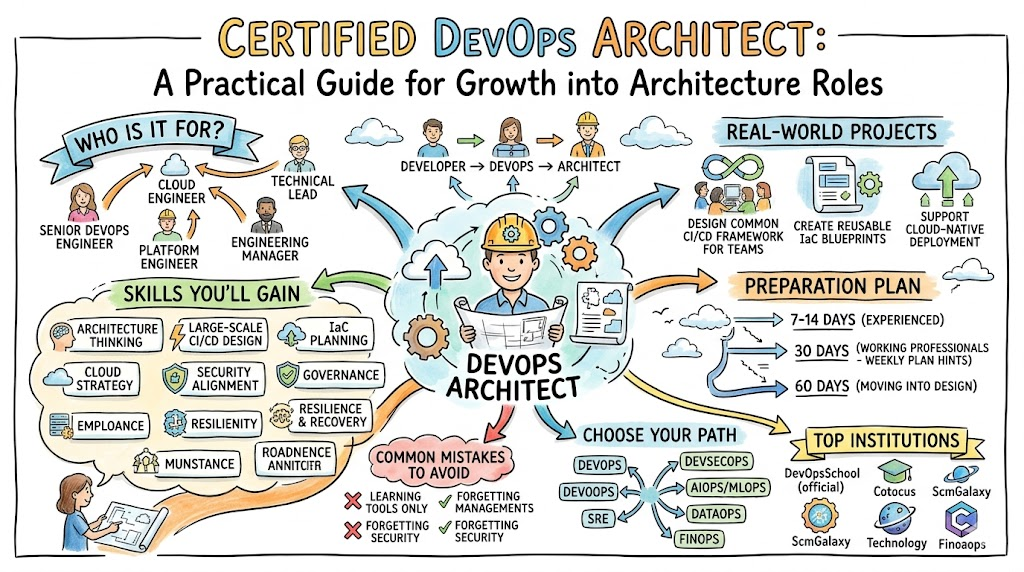 - Certification: Consider pursuing a Certified DevOps Architect (CDA) track to formalize your architectural skills.